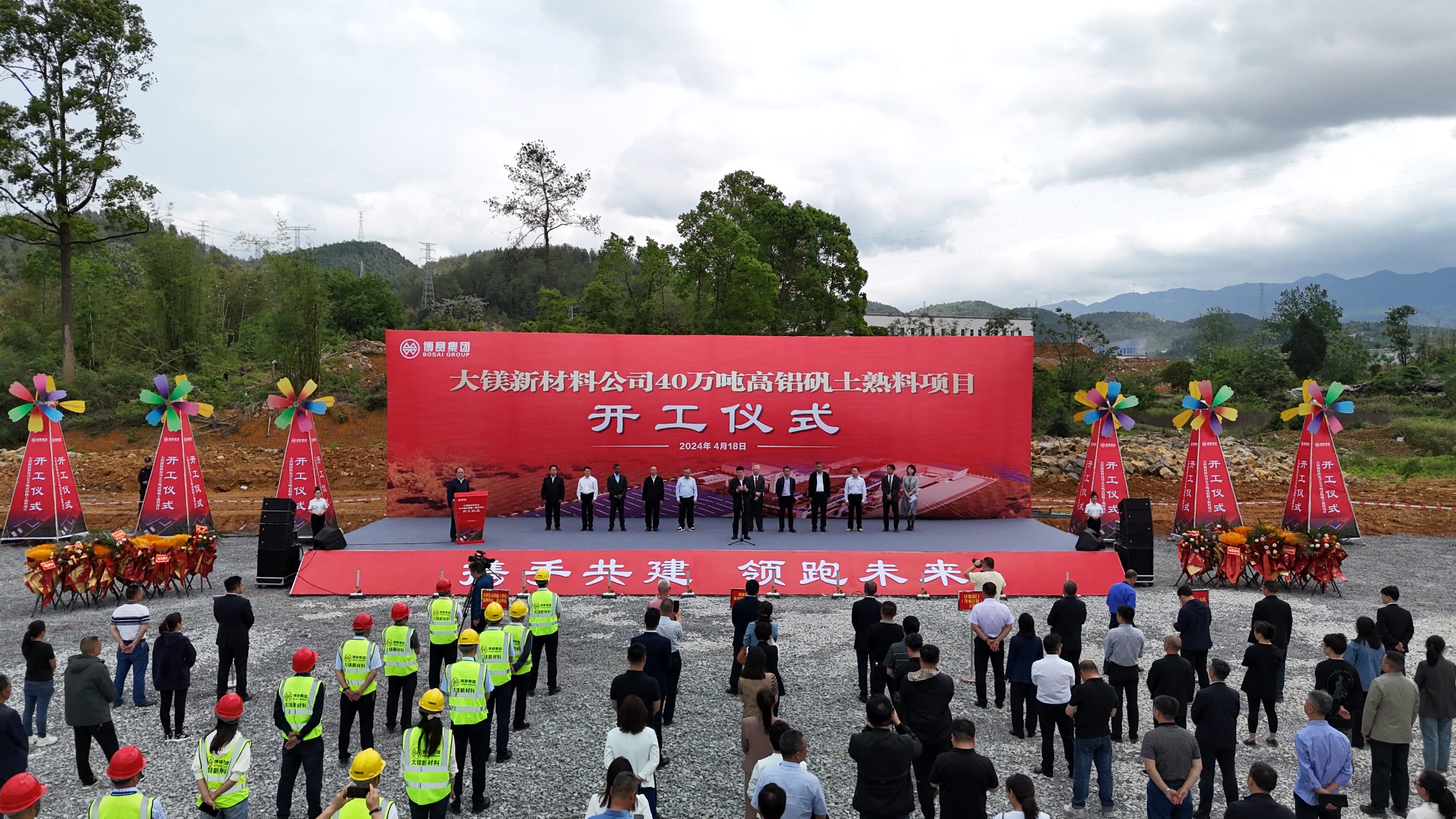 4月18日上午,博赛集团大镁新材料公司年产40万吨高铝矾土熟料项目在重庆市南川工业园区水江组团隆重开工,来自中国耐火材料行业协会、濮阳濮耐集团、北京利尔、奥镁大连、双日株式会社、美国大湖、凯得力中国等近20家海内外耐火材料行业知名企业负责人,南川区委区政府等地方领导,以及博赛集团高管及有关员工和施工方代表等上百人现场参加并见证了开工仪式盛典。